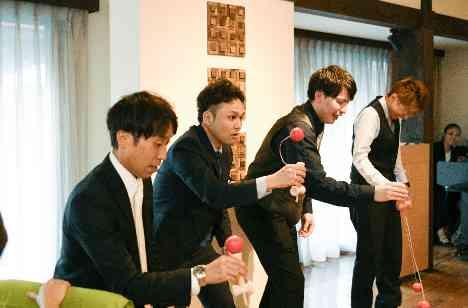 2部の挙式後のガーデンセレモニーでは、社会人ソフトボール部に所属しているご新郎様がユニフォームを着てトスバッティングをしました。当たった方にはギフトカードをプレゼント。ご披露宴では、再入場でお二人がサングラスをして、BIGクラッカーを鳴らしたり、ききうまい棒や、イントロクイズ、けん玉大会などのゲームをしたり、カラオケをしたりと、ゲストの皆様からもまるで二次会みたい!と楽しむ声が聞こえてきました♪