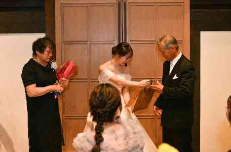 両家ともに長男・長女ということもあり、親御様にとっては初めて迎えるわが子の結婚式。皆様、この特別な一日を心待ちにされていました。「大好きな家族みんなと一緒にこの日を迎えたい」というおふたりの想いから、新郎様はお仕度の仕上げとして、親御様にジャケットを着せていただき、妹様にはブーケにリボンをむすんでいただきました。新婦様は弟様にエスコートしていただき、お母様にはベールダウンをお願いしました。