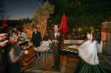 披露宴では、おふたりらしい遊び心あふれる演出が会場を盛り上げます。ウェディングケーキにはおふたりの大好きなピクミンが登場。すでにたくさんのピクミンが飾られたケーキが運ばれると、会場からは「かわいい!」の声が。おふたりが選んだピクミンを乗せて完成です。夕暮れのライトアップされたガーデンではデザートビュッフェも開催され、ケーキやスイーツを片手にゲスト同士で写真撮影を楽しむ、和やかな時間が広がりました。