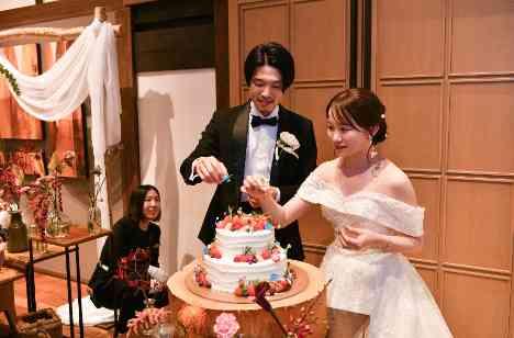 披露宴では、おふたりらしい遊び心あふれる演出が会場を盛り上げます。ウェディングケーキにはおふたりの大好きなピクミンが登場。すでにたくさんのピクミンが飾られたケーキが運ばれると、会場からは「かわいい!」の声が。おふたりが選んだピクミンを乗せて完成です。夕暮れのライトアップされたガーデンではデザートビュッフェも開催され、ケーキやスイーツを片手にゲスト同士で写真撮影を楽しむ、和やかな時間が広がりました。