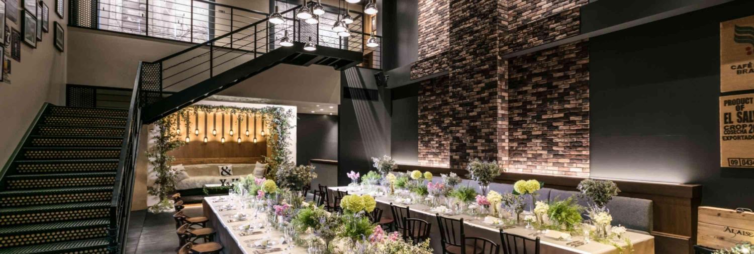 NYブルックリンをテーマにしたオシャレなレストランを貸し切り!オシャレでカッコいい、開放的な空間は一味違う雰囲気を味わっていただけます。ゲスト一人ひとりに想いが伝わる距離感も人気の理由です。
