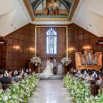 ステンドグラスから降り注ぐ祝福の光、13メートルの高い天井を彩る天井画、本物のパイプオルガンの音色が響く大聖堂では、立ち会ったすべての人々の心に残る感動的なセレモニーが叶います。