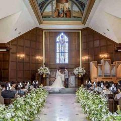 青く大きな空を背景に美しく映える純白の教会は圧巻!県内でも圧倒的なスケールでゲストの感動を誘います ステンドグラス輝く温かでクラシカルな雰囲気をぜひ体験して♪フェア当日は入場体験や演出体験も!