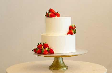 無駄を削ぎ落としたシンプルデザインのウエディングケーキはおふたりの雰囲気にもぴったり。クリームの付け方もあえてシンプルに。イチゴも適量をごろっとかざり、会場装飾にも入っているポイントカラーのゴールドを、ケーキでは金箔で表現。統一感のあるおしゃれなケーキデザインとなりました。ケーキ入刀の後には、当日バースデーのゲストの方へのサプライズ演出も♪