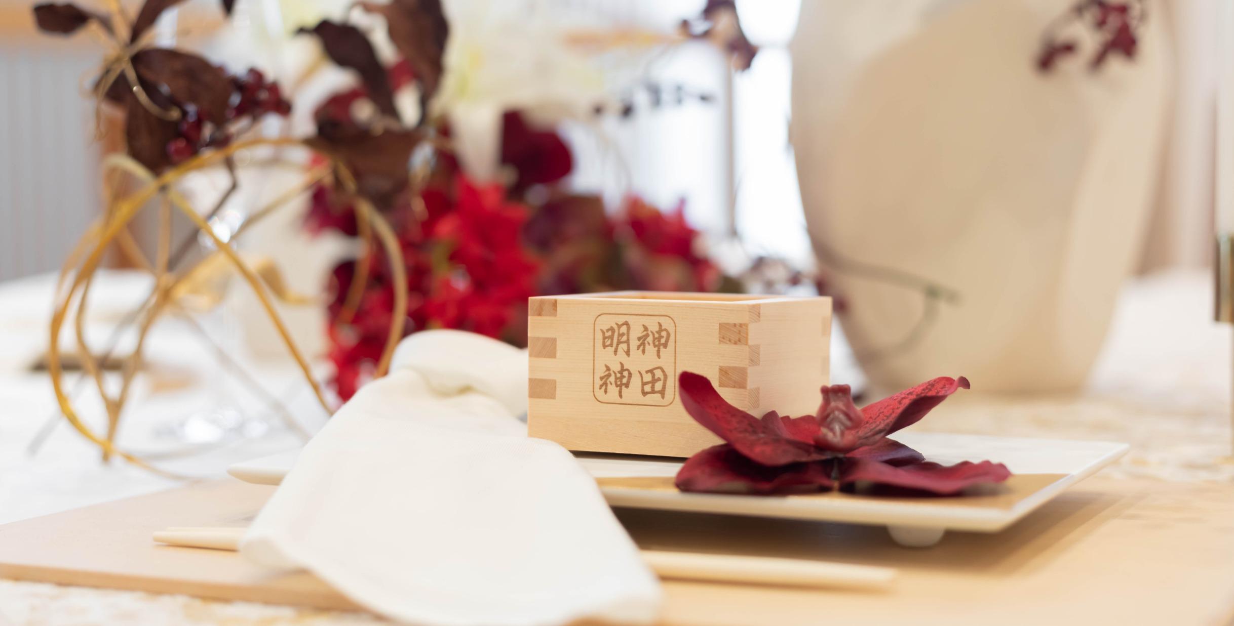 神田明神の御神酒として納められている唯一の酒造。祝い酒としても名高い『金婚』はおふたりのはじまりの一杯にご提供。料理をより一層引き立ててくれるお酒は、口に含んだ時に感じる米本来の甘さと余韻の長さが特徴