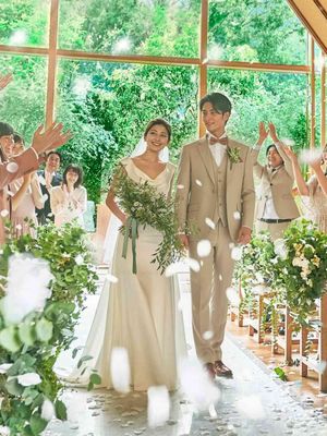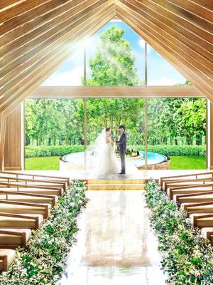 リニューアルで誕生した森のチャペルは、木のぬくもりと緑、水音が響く癒しの空間。シンボルツリーがふたりを見守る、ナチュラルで温かい誓いを。