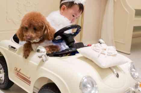1歳になったばかりのおふたりのお子様と愛犬がリングカーに乗って指輪を運んでくれました。 ブライダルフェアからワンちゃんも一緒に過ごせるなら 絶対にやりたいとおっしゃっていた演出のひとつです。 普段からゲストに可愛がってもらっているふたりの姿に会場内がとても癒されました。 ゲストだけではなくおふたりにも笑顔がこぼれた瞬間でした。