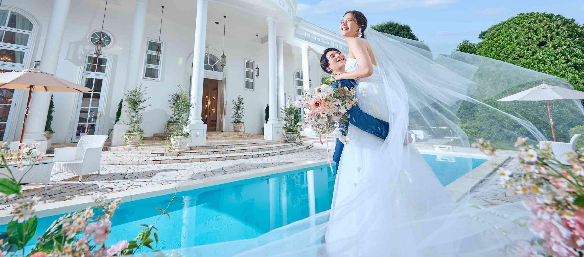 白を基調とした洗練されたコーディネートが可能なプール付きの会場。差し色にブラウンを用いて、温かみとスタイリッシュさを持ち合わせる。大きな窓からは自然光がたっぷりと注ぎ、会場全体が明るくナチュラルに。