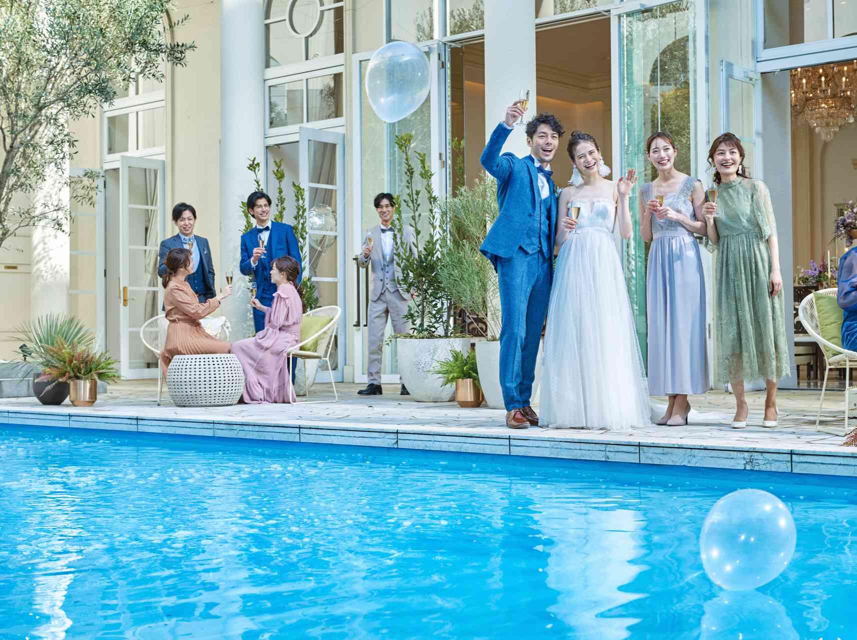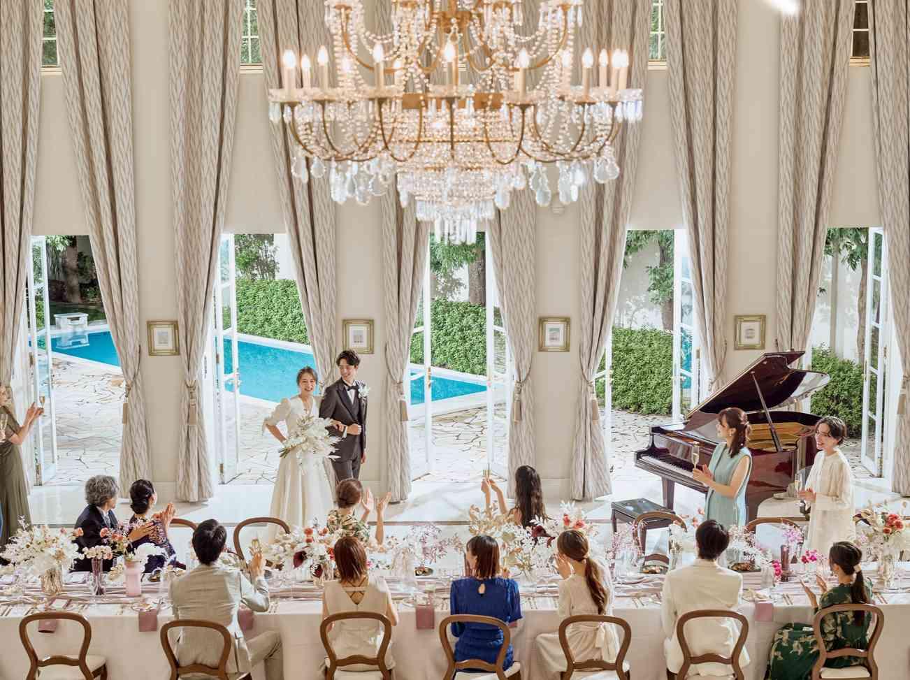 透明感と上品さが調和し、ラグジュアリーでありながらも開放感があり、華やかで明るいパーティーが叶います。隣接したプールサイドでパーティーも可能で、リゾートのような非日常感が演出できます。