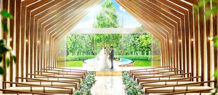 緑・光・水3つのワードで創出される世界観♪自然感じる温かな誓いの空間で特別なW。天井までの高い窓からは光が降り注ぎ、温かな雰囲気が満ちあふれる。自然と非日常にこだわって創上げた空間が広がる。祭壇に立つ二人の目の前には光を浴びて輝くシンボルツリーがそびえ、誓いセレモニーを印象的に。