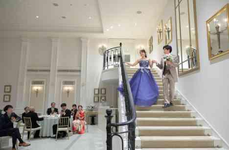 素敵なカラードレスへ変更した新婦さんが一番素敵に見えるのは階段からの入場です! 階段をおりるときにドレスが揺れて、後ろ姿まで素敵に見えます。ゲストの方も入場したタイミングで思わず「素敵…!」と声がでてしまいます。 おふたりの入場での一体感は結婚式ならではの瞬間になります!お二人がより素敵に、ロマンティックに見える特別な時間を過ごしましょう!