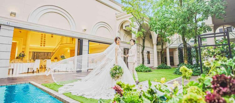 披露宴が始まる前のひとときを、ガーデンでのウェルカムパーティに。色鮮やかなドリンクやピンチョスを片手に、ゲストと近い距離で会話を楽しめます。プールサイドの開放的な雰囲気が緊張をほぐし、アットホームなパーティの幕開けを演出します。