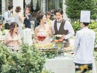 開放的なガーデンで楽しむデザートビュッフェ。青空の下、ゲストと会話が弾むひととき