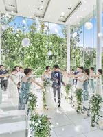 挙式後はゲスト全員から16メートルのバージンロードで祝福のフラワーシャワーと拍手が送られます。緑・空・自然光に包まれたチャペルでのフラワーシャワーはより一層ゲストの心に刻まれ、ゲストと共に幸せのひと時を過ごすことができます。