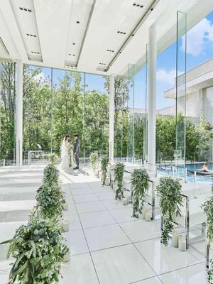 天井高5.5メートルとガラス張りのチャペルは光が差し込み自然との調和を感じながら、二人の新たな始まりを祝福し、神聖な誓いの場をより印象深くします。