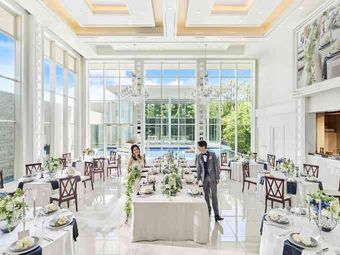 窓から差し込む光が輝き、目の前に水辺と緑が広がる披露宴会場「アクアグレイス」