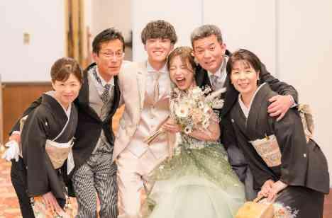 披露宴後、ご家族6名で撮影した、最高の1枚。 結婚式は、おふたりが新しい家族を築くスタートであると同時に、これまで育ててくれた両家の家族が一つになる日でもあります。特に、披露宴の感動が冷めやらぬタイミングでのお写真は、感謝と喜びに満ちた最高の表情を残せました。 これから式を挙げられる皆さんも、ぜひこの「家族の結びつき」を形に残す撮影時間を大切にしてください。