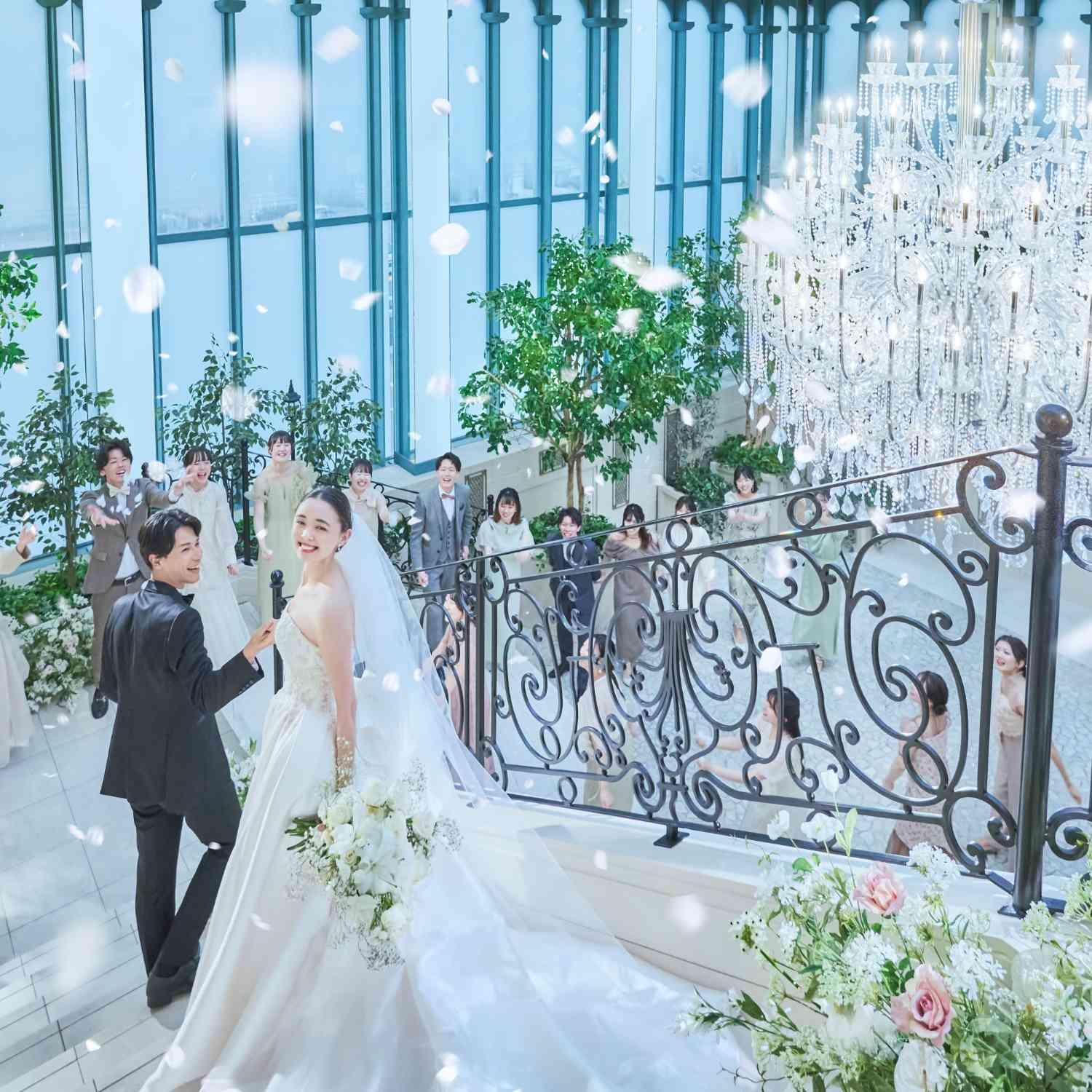 披露宴会場は、上質×アットホームなガーデン付き会場と、少人数にもぴったりな格式高い和モダンの会場からお選びいただけます。開放感溢れるアトリウムは全天候型なので、お天気を気にせずフラワーシャワーが楽しめます! - Topics3.