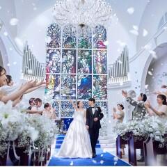 【「青」が印象的で美しい教会での入場体験】純白のウェディングドレスが、綺麗に映えるロイヤルブルーのバージンロードは、花嫁とゲストからも評判を頂いております。人前式や善光寺式も承り可。