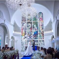 「青」が印象的で美しい教会での入場体験】純白のウェディングドレスが、綺麗に映えるロイヤルブルーのバージンロードは、"他にないような魅力"と花嫁やゲストからの評判も◎。オリジナル人前式や善光寺式も承り可
