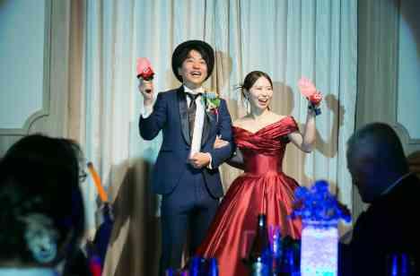 おふたりの出会いのきっかけになったのは共通のアーティスト♪ 再入場の際にはそのアーティストの楽曲で踊りながら再入場 BGMやダンス、ペンライトを降っているゲストで会場はまさにLIVE会場さながら大盛り上がり! ちなみにおふたりのご入籍日や入籍時のご年齢等も、お好きなアーティストにちなんだお日にちになっております!