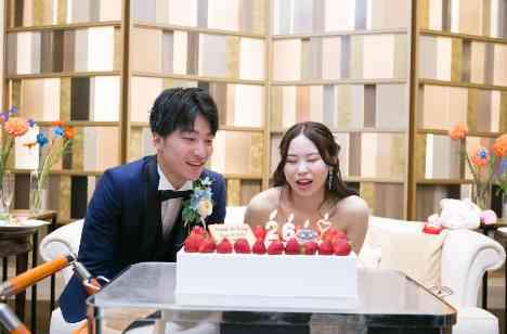 結婚式を実施した「5月」はおふたりの誕生月♪ だからこそ、ケーキにはこだわり抜いたおふたり こだわりの苺でバースデーケーキを作成✽ プランナー、パティシエとの沢山のお打合せを重ねて 自慢のケーキが完成! ロウソクの火消しも息ピッタリで大成功! 自慢のバースデーケーキはもちろんゲストの皆様には配布して全員で楽しみました♪