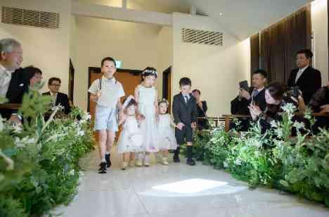 ご家族婚でしたので、今まで大切に育ててくださったご家族への感謝もしっかり伝えたいというお二人。 挙式では両家のお父様、お母様よりジャケットセレモニーやベールダウンをしてもらい 直接感謝もお伝えになりました。 ご参列いただく親族の中には可愛いお子様ゲストが沢山おりました。 リングボーイ、リングガール、ブックボーイ、ブックガールと総勢5名のお子様に活躍してもらいました。