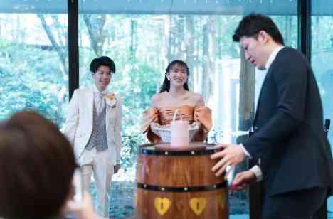 テーブル対抗の巨大樽を使ったサプライズゲーム。各テーブルの代表者にご参加いただき、順番に剣を樽の穴へ差し込んでいただきました。ドキドキが高まる中、見事剣が仕掛けに当たると、大きな音とともにクラッカーが炸裂! 当たったテーブルの皆様には素敵なプレゼントが贈られ、会場全体が歓声と笑顔で溢れました。参加型のハラハラドキドキな演出は、記憶に残る楽しいひとときとなりました。