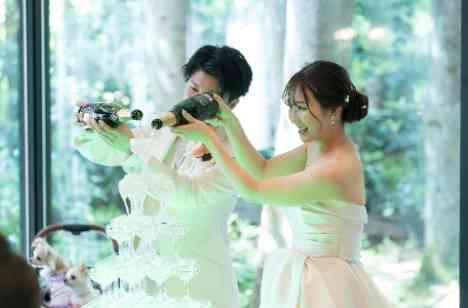 ウェディングケーキ入刀の代わりに、お二人の愛を注ぐシャンパンタワーセレモニーを行いました。新郎新婦が互いのグラスへ丁寧に注ぐたび、ゲストからの祝福の拍手が鳴り響き、会場はロマンティックな雰囲気に包まれました。きらめく泡は、お二人の末永い幸せを象徴しているかのようでした。感動的で、記憶に残る素敵なワンシーンとなりました。