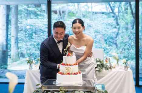 華やかなケーキ入刀では、ふたりの楽しそうな表情がとても印象的でした。 ゲストの温かい拍手や笑顔に包まれながら、幸せなひとときを皆で分かち合います。 美しいケーキを前に、歓声や笑い声が会場全体に広がり、親しい家族や友人たちとの距離もぐっと近づく瞬間に。 おふたりの笑顔と楽しげな空気が、披露宴をより温かくアットホームな時間に彩りました。
