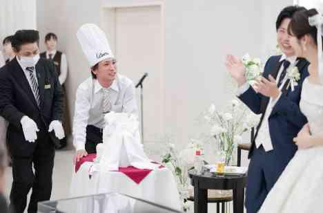 披露宴の中盤に登場したのは、ゲスト参加型のウエディングケーキ演出。 コック帽をかぶったゲストがケーキを運ぶというサプライズに、会場は一気に笑顔に包まれました。 続くケーキ入刀では温かな拍手が送られ、新郎新婦様が同時に行うファーストバイトで、和やかな雰囲気が広がります。 さらに、招待状の返信が早かったゲストへのサプライズバイトも行われ、驚きと楽しさが重なる、印象的なひとときとなりました。