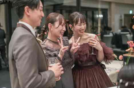 披露宴後半は、歓談と写真撮影を中心にしたリラックスした時間。おふたりも自由にゲストのもとへ足を運び、言葉を交わしながら写真撮影を楽しまれました。テーブルを越えて生まれる笑顔や会話は、形式にとらわれないおふたりらしさそのもの。大切な人たち一人ひとりと過ごす時間を大切にしたひとときは、心に残る温かな思い出として刻まれました。