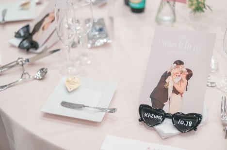 ゲストテーブルには、サングラスをモチーフにしたオリジナル席札をご用意。おふたりの遊び心が感じられるアイテムに、席に着いた瞬間から笑顔が広がります。写真撮影では自然とサングラスを身につけるゲストも多く、会場全体が一体となった楽しい雰囲気に。細やかなアイデアが詰まった席札は、披露宴の時間をより印象的に彩り、ゲストの記憶に残る素敵な演出となりました。