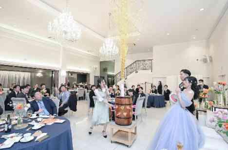 本文: 披露宴後半には、ゲスト参加型の黒ひげゲームを開催。どこに当たるか分からないドキドキ感に、会場中が注目します。見事当たりを引いた方には、お肉の目録をプレゼント。さらに参加賞も用意されており、皆様に楽しんでいただける演出となりました。世代を問わず盛り上がる時間となり、笑顔と笑い声が絶えないひとときでした。