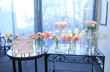 披露宴では、フラワービュッフェをご用意。色とりどりのお花の中から、ゲストの皆様が一輪ずつお好きな花を選び、テーブルごとにオリジナルの装花を完成させていきます。どのテーブルも組み合わせは異なり、世界にひとつだけのコーディネートに。花を手に取りながら自然と会話も弾み、笑顔が広がる和やかなひとときとなりました。皆様とともに創り上げる空間は、温もりに満ちた特別な時間となりました。