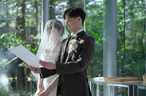 大切な皆様に見守られながら執り行われた人前式。誓いの言葉は、ご列席の皆様へ向けて届けられました。おふたりらしい温かな言葉に、会場は優しい空気に包まれます。 結婚証明書としてご用意されたのは、ゲスト参加型のキャンバスボード。皆様にご協力いただいたボードへ、挙式中におふたりがサインを入れ、世界にひとつだけの証明書が完成いたしました。大切な方々とともに創り上げた、絆を感じるセレモニーとなりました。