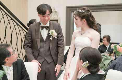 歓談のお時間には、おふたりがメインテーブルを離れ、ゲストテーブルへと足を運ばれました。お一人おひとりと言葉を交わしながら、お写真撮影を楽しまれるご様子はとても和やかで、会場全体が温かな空気に包まれます。これまでの感謝の気持ちを直接伝えられる大切なひとときとなり、笑顔と笑い声が絶えない時間に。おふたりとゲストの距離がより一層近づく、心に残る歓談のお時間となりました。