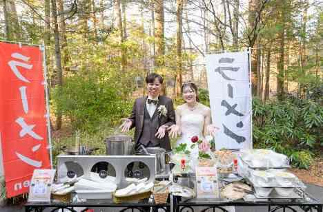 披露宴の後半には、ラーメンビュッフェが登場。会場内に広がる湯気と香りに、ゲストの皆様からは歓声が上がりました。新郎新婦様が自らゲストへ振る舞う場面もあり、自然と笑顔と会話が広がります。お好みで麺やスープ、トッピングを自由に選び、自分だけの一杯を完成させるスタイルは大好評。世代を問わずお楽しみいただける演出となり、おふたりらしい温かな心配りが感じられる、思い出深いひとときとなりました。