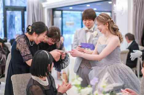 披露宴の後半では、ゲストの皆様とゆっくり触れ合うテーブルフォトラウンドのお時間を。各テーブルでくじを引いていただき、当たりを引いた方へはおふたりからプレゼントをご用意しました。どなたが当たるのかドキドキしながらくじを開く時間も楽しいひとときに。プレゼントをお渡ししながらゲスト一人ひとりと会話を交わし、笑顔で記念撮影を行いました。会場全体が温かな一体感に包まれた時間となりました。