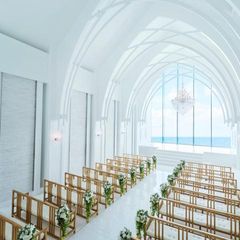 【天空に浮かぶパノラマチャペル】自然光降り注ぐチャペルで入場体験!ハープ・バイオリンの生演奏とゲスト全員に見守られる感動のチャペル。海のリゾートならではの雰囲気をお楽しみください※100名着席可能
