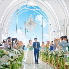 【海の絶景ロケーション】自然光降り注ぐチャペルで入場体験!ハープ・バイオリンの生演奏とゲスト全員に見守られる感動のチャペル。海のリゾートならではの雰囲気をお楽しみください※100名着席可能