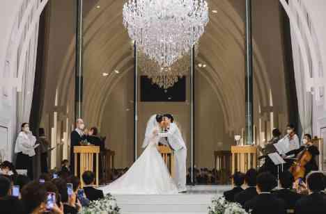 チャペルでのクライマックスのシーン! チャペルムービーを見て祭壇の手前でお父様と新郎様がバトンタッチをされお二人で祭壇の上に、、、 最後のクライマックスのシーンでの誓いのキス まさにご結婚式の中で一番皆様が盛り上がるシーン 誓いのキスのクライマックスでなんと上から天使の祝福が舞を降りてくるところもポイント!