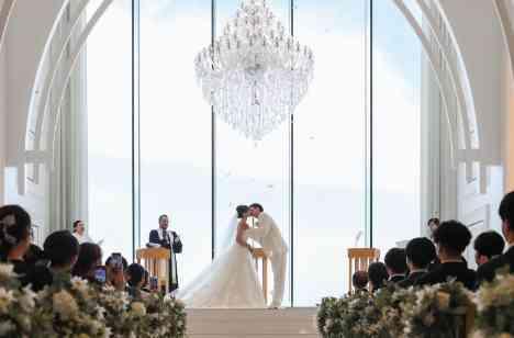 圧巻のキスシーン! 挙式は新郎様が先にバージンロードを歩まれ、新婦様はそのあとにバージンロードをお父様と進みます。 祭壇の手前でお父様からのバトンタッチを経て新郎新婦様お二人で祭壇に上がります。 最後のクライマックスでキスシーンでなんと天使の羽が舞い降りてきます。実は、天使の羽にも意味合いがあり幸せのベールをまとうという意味があります。
