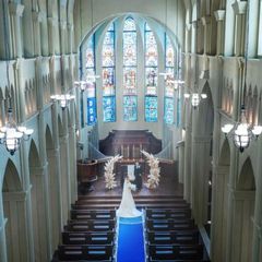【青の大聖堂挙式体験】会場見学時に実際の会場を体験してみて。300年の歴史を持つステンドグラスと調度品に囲まれた世界観。日本でも珍しい階段入場ができる大聖堂は一見の価値あり。