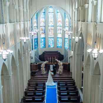 永遠に続く空や海を連想させるロイヤルブルーのバージンロードとステンドグラスが輝く大聖堂!