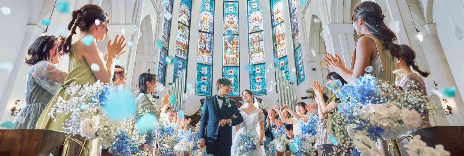 祭壇まで続くバージンロードとステンドグラスは、空や海を想起させる「永遠」を意味するロイヤルブルー。純白のドレスとのコントラストが鮮やかに花嫁をより一層美しく際立たせます。憧れの階段入場で感動も最高潮に