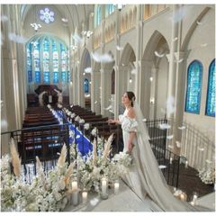 【県内最大級の白亜の大聖堂】セント・アドラシオンで貸切の入場体験 正面にはサムシングブルーになぞらえた高さ7mのステンドグラスが2人の誓いを見守ります 写真だけでは伝わらない想像を超える感動を