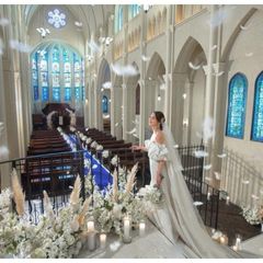 【壮麗な大聖堂での入場体験】大聖堂に輝くブルーのステンドグラスやパイプオルガンの生演奏に包まれ、約20mのヴァージンロードを歩き本番をイメージ♪階段入場でゲストの視線を独り占めしよう!