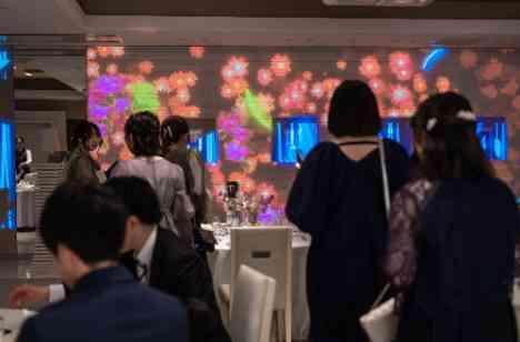 おふたりが選んだ会場「フェアリー」はプロジェクションマッピング演出が可能。扉の向こうに広がる壁一面のマッピングにゲストからは歓声が巻き起こりました。 これから始まるパーティーにワクワクが止まらない様子のゲストの皆様。おふたりからのメッセージが添えられたテーブルにご着席されおふたりの入場を待ちきれない様子でした。 装花やペーパーアイテム・音楽にお料理…拘りのアイテムに囲まれ笑顔の時間が流れます。