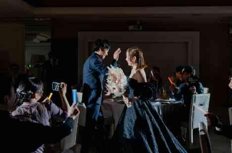 照明が落とされた会場内はゲストの振るサイリウムの光りでまるでライブ会場のような雰囲気に。 会場の構造をいかし、両サイドからそれぞれご入場されたおふたり!ゲストテーブルの真ん中にはセンター通路を設置し、音楽と光が演出するライブ会場が出現!!拍手の中、ハイタッチですれ違う様子に会場中から歓声が沸き起こりました! 日頃の感謝も忘れないおふたりだからこその1日が感動と共にフィナーレを迎えました。